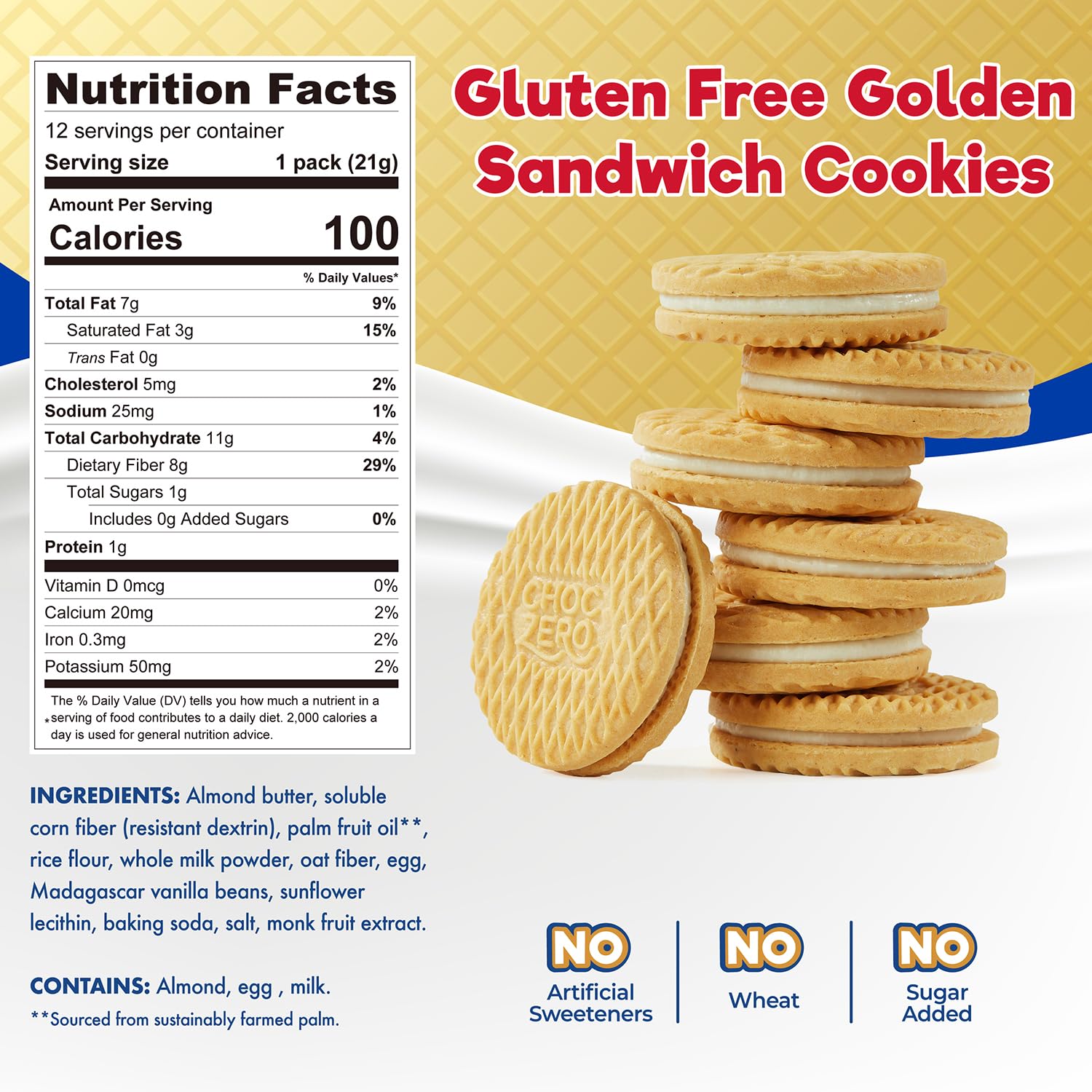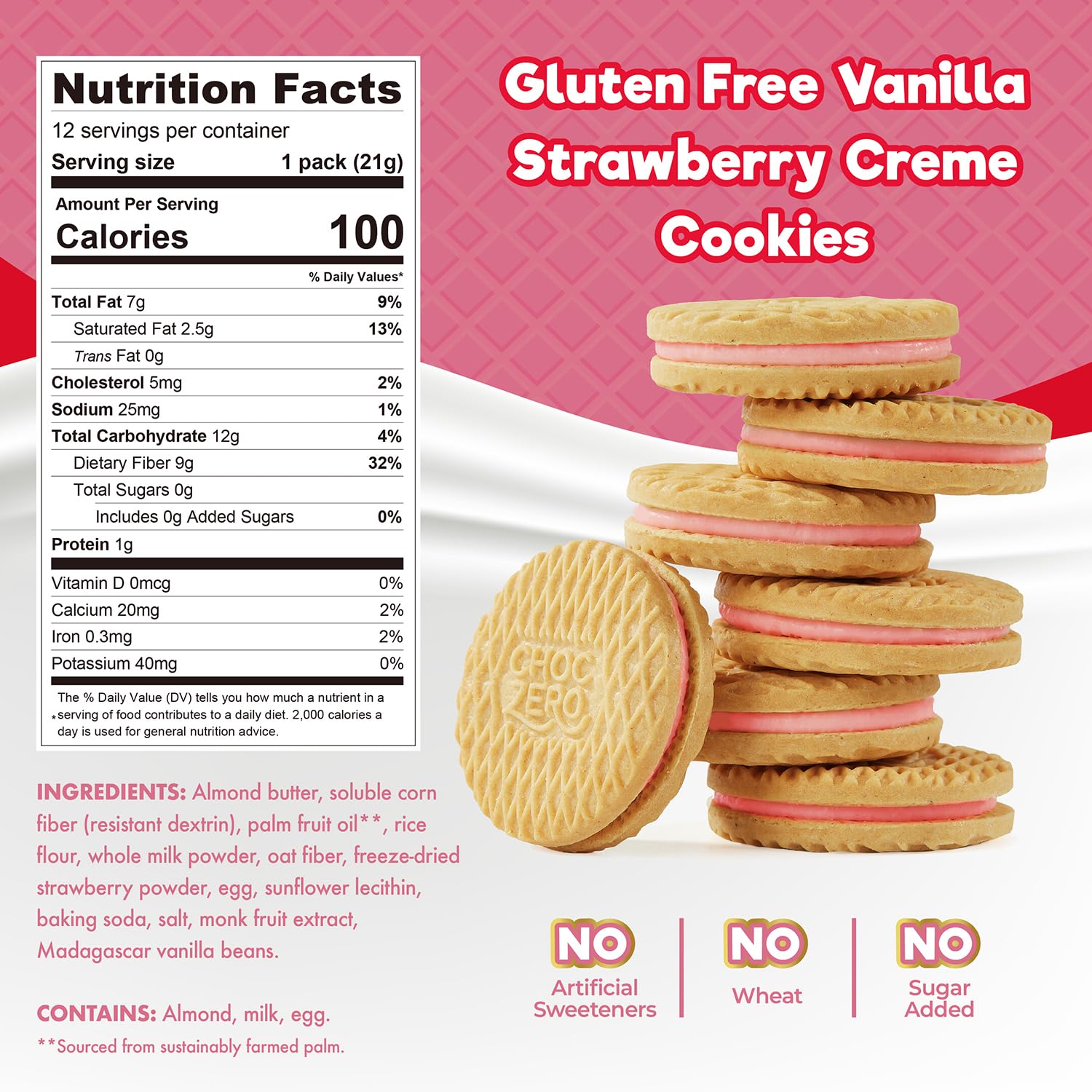 - Gluten free sandwich cookies with vanilla creme: each keto cookie is low in net carbs and keto friendly