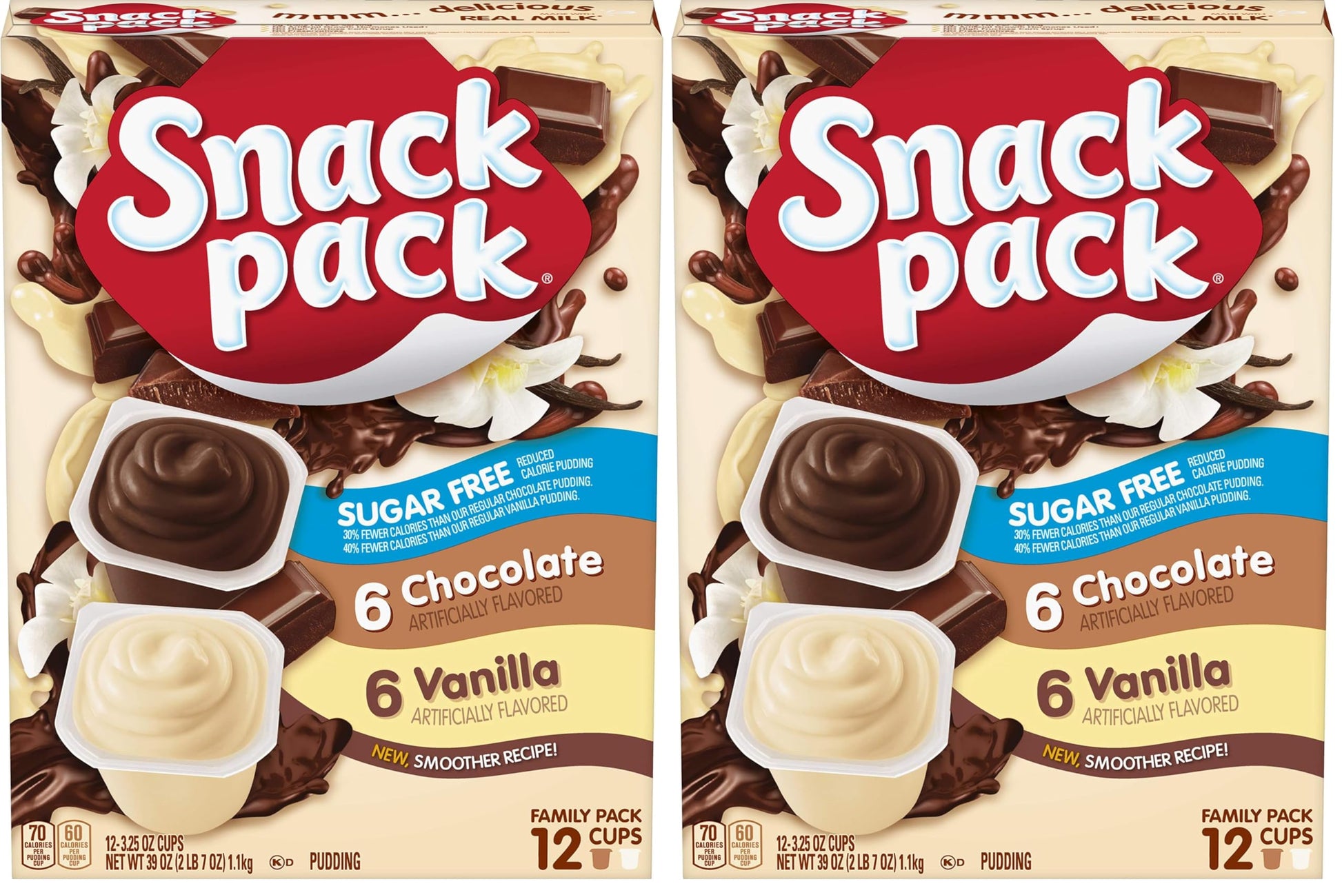 - Twelve count family packs of Snack Pack Zero Sugar Chocolate Pudding and Vanilla Pudding Cups, with six chocolate pudding cups and six vanilla pudding cups